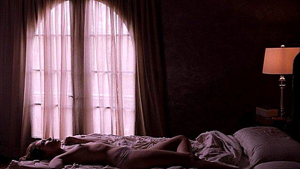 לילי סימונס עירומה מלטפת את פותה על המיטה בסצנה מסרט