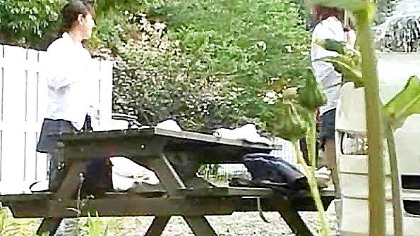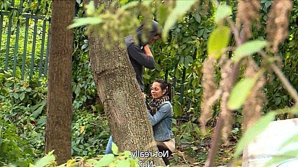 A bitch with big tits stood by a tree in the park and rubs her pussy
