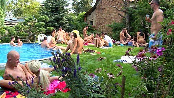 Mature woman with healthy tits relaxing in the yard and swimming in the pool